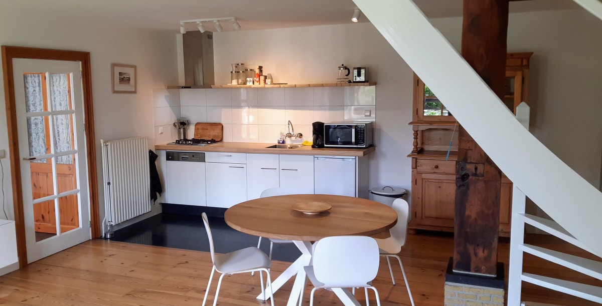 Het appartement bevindt zich aan de voorzijde van de prachtige stolpboerderij en heeft een eigen terras. Er is een parkeerplek voor u op het erf en een fietsenstalling voor de fiets. Daarnaast kunt u de gezamenlijke tuin (1620m2) gebruiken waar ook een Finse Sauna en buitenkeuken aanwezig zijn.
